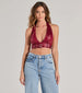 Take on a sultry vibe in this faux leather crop top featuring a plunge halter V-neckline and an adjustable belted crop hem for an edgy flair. Style with a mini skirt for a night out.