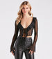 Bring the heat with a sultry top that will radiate summer vibes! It features a V-neckline with a ruffled trim. a tie-front design. long fitted sleeves with cute flared hems. and a cropped. form-hugging fit. The red top has a sheer mesh fabric with an eye-catching swirl print pattern. The black top has a solid sheer mesh fabric. Style with high-rise shorts and sandals.