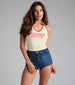 Serve it-girl energy in this trendy graphic top featuring a halter V-neck. fitted cropped hem. and script reading. "Sunshine Hottie." Style with cutoff denim shorts and sneakers.