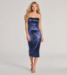 A strapless glitter satin formal dress that sparkles in a form-hugging silhouette and front slit for a flirty flair along the midi-length hem. Style with heels for any occasion.