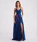 Gleaming with glitter. the Tanya formal dress transforms into a glistening display under the dance floor lights! A stunning option for prom. galas. and black tie events. She features a sleeveless V-neckline. adjustable spaghetti straps. a lightly padded bust. and hidden side pockets for keeping your hands warm. Her flattering A-line silhouette leads to her floor-sweeping hem showcasing a sultry high slit. The formal dress is composed of a glitter woven fabric with a stretchy knit lining. Complete the look with a dainty lariat necklace and earrings.