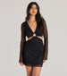 Get in the summer vibe with this crochet mini dress perfect for pool parties or vacation! Featuring sheer flared long sleeves for a trendy touch. a sexy V-neckline. and a cutout waist and back for a daring look. The hoop insert adds a unique twist and the tie-back design creates a flattering look along the bodycon silhouette. Complete the look with sunglasses and sandals!