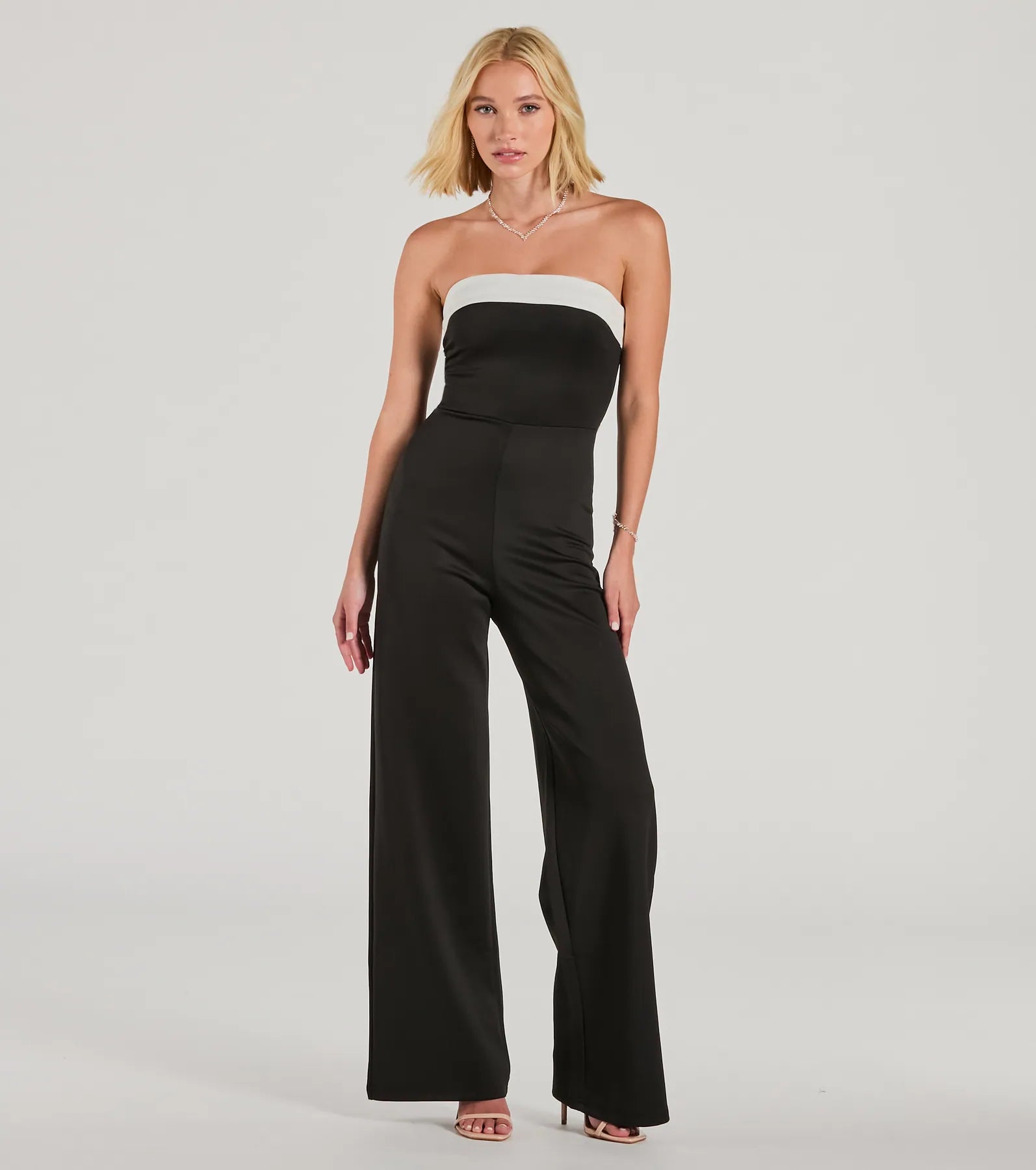 No one can hide their admiration for your chicness in this strapless jumpsuit perfect for cocktail hour! It features a chic contrast strapless neckline. a side zipper closure. and a flattering wide-leg silhouette on smooth knit fabric. Complete the look in stiletto heels.