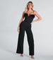 Babe. it's time to slay in this iconic and chic marabou feather jumpsuit! It features a notched wired V-neckline with a fabulous marabou feather trim. adjustable spaghetti straps. a fitted high waist. a hip-hugging fit to show off your curves. and a trendy wide-leg silhouette. The crepe fabric offers a moderate stretch. Style this jumpsuit with a sparkly rhinestone belt to snatch your waist and a pair of platform heels!