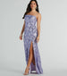 Beautifully embellished with sequins in scroll patterns. the Tori formal dress captivates everyone at prom or banquets! She's designed with an elegant cowl neckline and adjustable spaghetti straps so you customize the fit. while the mermaid silhouette flaunts your hourglass. and high front slit adds a touch of allure perfect for any formal occasion. Style the gown with earrings. a clutch. and heels for an unforgettable evening look!