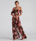 Radiate your beauty in this blooming floral printed maxi dress! It features a romantic off-the-shoulder neckline. short ruffled drape sleeves. an empire waist. and a flowy floor-length silhouette with dual high front slits. Style this dress with strappy sandals.