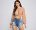Keep it totally chic with this cute tie-front top! The top features a plunging V-neckline. a tie-front accent. long bishop sleeves. a cropped hem. and an eyelet pattern. Complete look with cutoff shorts.