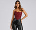 Stay on trend with a corset that is perf for those Insta-worthy moments! The corset features a strapless square neckline. contrast piping with flexible boning. a mesh overlay. and a cropped hem. The corset is composed of a faux leather fabric that offers a form-hugging fit with minimal stretch. Complete look with high waist jeans and mules.