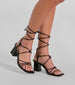 Elevate your trendy status with these sleek lace-up faux leather block heels. They feature an open square-shaped toe. a thin knotted strappy design leading to chic lace-up straps with a tie closure. an open back. and a short block heel for comfortable wear. Style with a clutch bag.