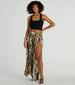 Capture the breezy tropical vibes in this flowy printed dual-slit maxi skirt! The lightweight stretchy knit fabric showcases a tropical palm leaf print for an iconic poolside look on your dreamy vacay. It features a flattering high-rise elasticized waistband. a built-in cheeky lining. dual high front slits to bare some skin. and a maxi-length hem. Style with a crop top and strappy sandals.