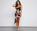Take in those tropical vibes with a midi dress that will have you vacay-ready! The dress features a tropical palm leaf print. a sleeveless scoop neckline. adjustable spaghetti straps that cross at the back. and an asymmetrical hem. The dress is composed of a smooth knit fabric that offers a form hugging fit with a moderate stretch. Complete look with hoops and sandals.