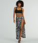 Give off major tropical vibes whether you're jet-setting to a dreamy oasis or headed to a weekend getaway in this printed maxi skirt! The stretchy knit fabric showcases a bold contrasting tropical print for a stylish allure. and includes a built-in knit brief for coverage. The skirt features a high-rise elasticized waist. a wrap-front design creating a sultry high slit. and a flowy A-line fit on the maxi-length silhouette. Pair with a basic tank top and strappy sandals.Â