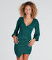 Crafted luxuriously of glitter knit fabric. this party mini dress offers a bold and sparkly statement. The dress features peasant long sleeves. a surplice plunge V-neckline. a side pleated seam. and a flattering bodycon silhouette with a wrap mini-length hem. Complete the look with earrings for a holiday party or dinner!