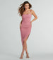 Have yourself a twinkling night in this shimmering glitter midi dress perfect for birthdays or graduations! Featuring a sleeveless cowl neckline. adjustable spaghetti straps. a bodycon silhouette. and an asymmetrical side slit. Complete the look in platform heels.