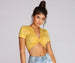 Twist and style it up with this adorable crop top! It features short sleeves. a V neckline created by a twist front. and a cropped hem. The top is composed of a french terry knit fabric that offers plenty of stretch.