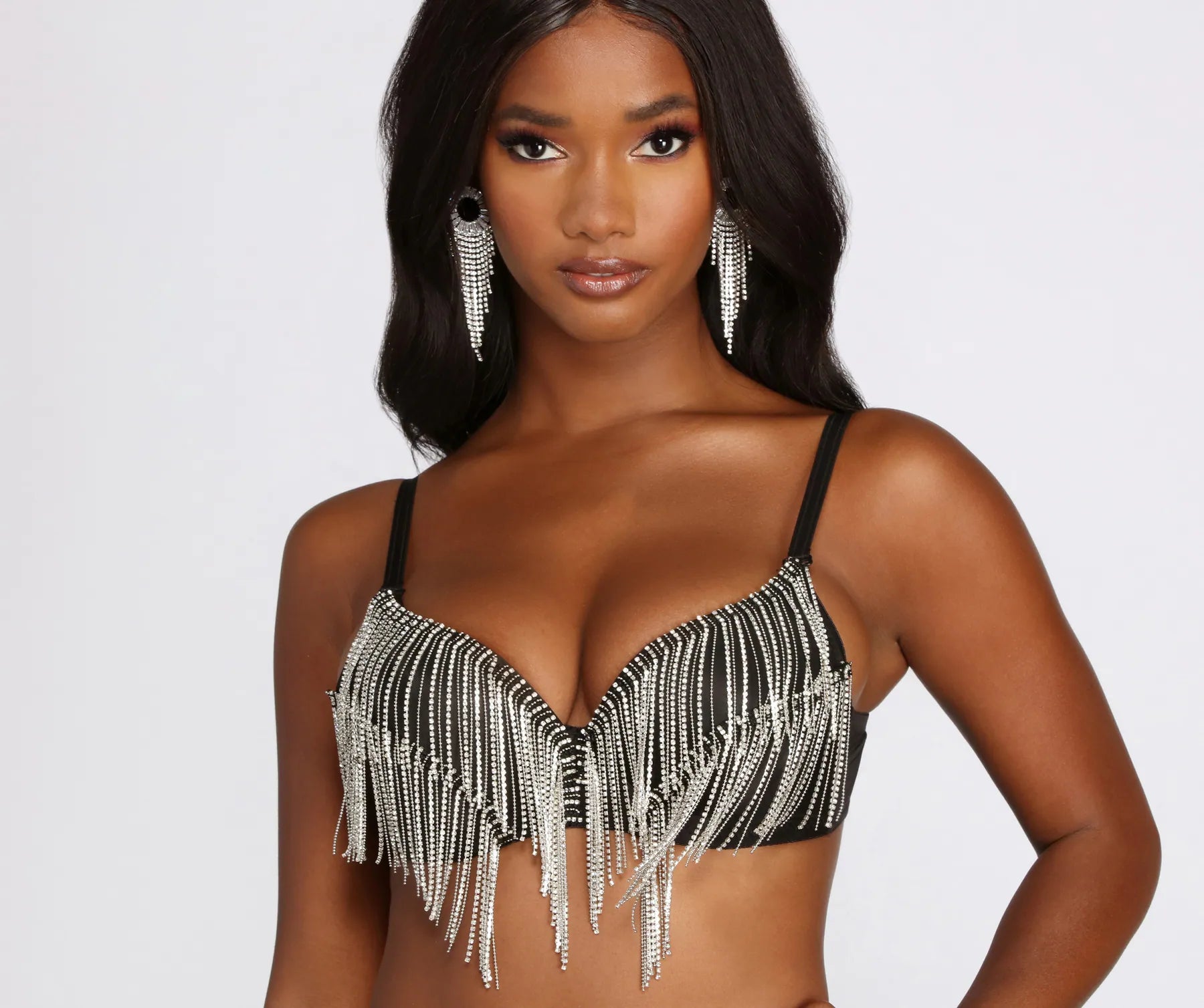 Give us a little twist. and a lil' twirl. how can you resist in rhinestone fringe!? Talk about a perf festival vibe. pair with high waist shorts and a hat!