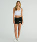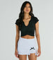 A mini skort that makes you look like an ultra cute icon! This playful skort features a high-rise waist for a flattering fit. with a skirt overlay adorned with an adorable side ribbon bow and slit. Made with a form-hugging woven fabric. it's perfect for showing off those killer legs in a mini-length hem. Complete the look in a crop top.
