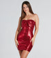 Bring about the perfect shine in this sequin mini dress this holiday season! All is merry and bright with you in this showstopping mini-length dress featuring a strapless neckline. a front statement bow across the bust. and a flattering bodycon silhouette. Complete the look in sleek stiletto heels for parties. banquets. and celebrations!
