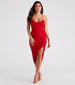 Let their eyes unwrap you in this sultry lace midi dress that's absolute perfection for date night! Featuring a sleeveless V-neck. spaghetti straps that cross along the back. and a bodycon silhouette with a scallop trim slit. The dress is composed of a delicate lace fabric with partial lining and minimal stretch. Complete the look with a chic ring set and heels.