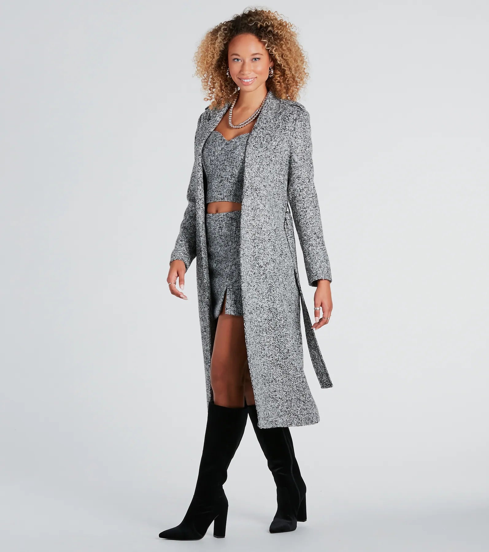 This sophisticated tweed trench coat is perfect for making a chic statement! With a flattering tailored fit. the coat features long sleeves with button cuffs. shoulder pads. strap button accents. a lapel collar neckline. hidden side pockets for keeping your hands warm. a tie-waist belt. and a longline hem. The coat is crafted from tweed fabric with a sewn-in woven lining. Complete the look with the matching corset top and mini skirt.