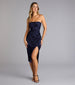 All eyes on you—the strapless silhouette and velvet flocked florals do all the talking. With a bodycon fit and leg-baring slit. this midi dress is pure confidence in motion.