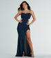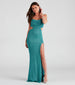 Arrive at the event ready to celebrate in the Victoria formal dress designed on a glitter knit that glistens from every angle! She features a sleeveless. cowl neckline. spaghetti straps. a fitted bodice. and an open-back design. Flaunt your curves along her form-hugging. mermaid silhouette showcasing a sultry high-cut slit and a floor-length hem. The formal dress is composed of a stretch-knit fabric with a lining. Complete your dressy look with a clutch and heels.