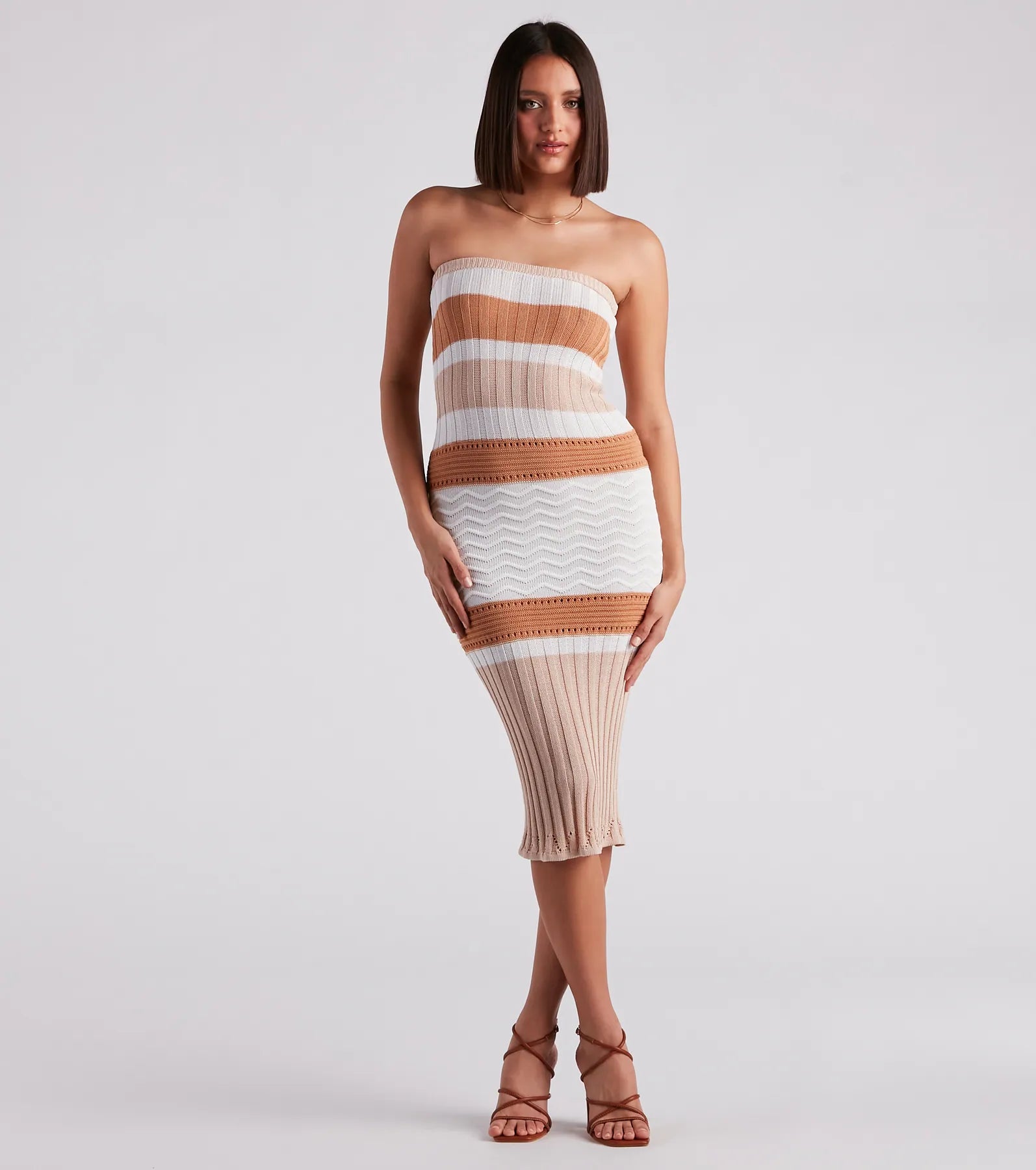 This on-trend striped midi sweater dress is perfect for casual weekend dates this season! It features a strapless straight across neckline with an elasticized hem. a striped color block design down the silhouette of the dress with crochet accents in the knit fabric. a midi-length hem. and a curve-hugging fit. The ribbed knit fabric offers plenty of stretch. Style with strappy sandals.
