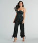 Give your LBD a break and check this woven strapless jumpsuit for your next weekend fit! It features a strapless sweetheart neckline. a bustier bodice with a padded bust. and flexible boning for a snatched look. With hidden side pockets and lower flap pockets. you'll be able to keep your must-haves close while sporting the chic. wide-leg silhouette with adjustable drawstring cuffs so you can customize the style. Complete the look with a sleek snake chain choker for day or night!