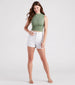 You'll be ready for casual weekend plans with these trendy denim mom shorts. They feature a super high-rise waist with a front button and hidden zipper closure. rolled hems. and a relaxed fit. The denim fabric offers a rigid fit with no stretch. Style with a graphic tee and sandals.