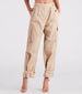 Amp up your casual weekend style with these on-trend cargo pants. They feature a high-rise waist with belt loops. front and back pockets. large cargo-style side pockets. a relaxed fit throughout the leg. and cool ankle tab accents for a cinched look. Complete the outfit with a crop top and mules.