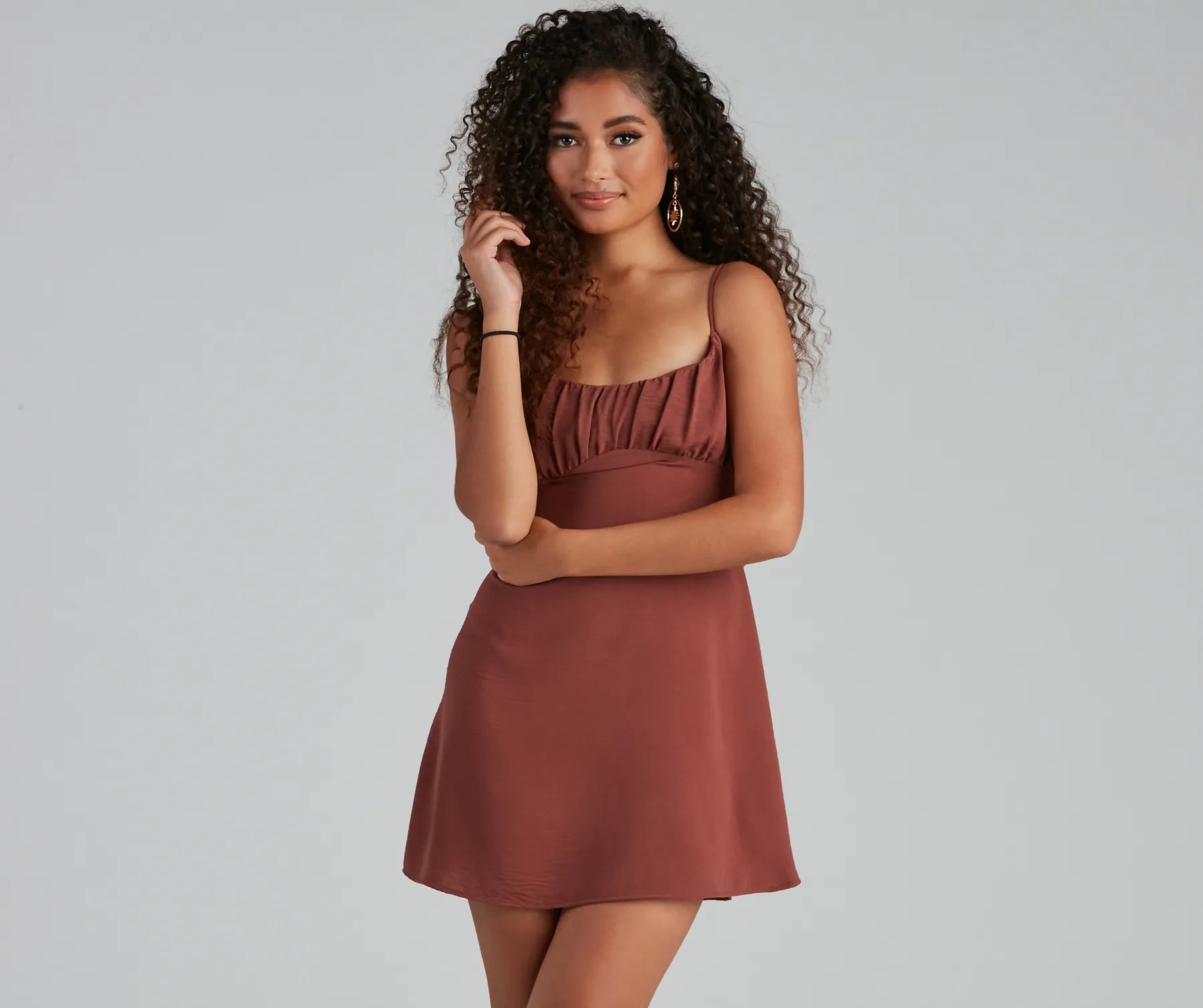 Planning a weekend vacay? Don't forget to pack this adorable satin dress! It features spaghetti straps and a ruched bust. a mini-length hem. and an open back with self-tie detail. Complete the look chic mules.