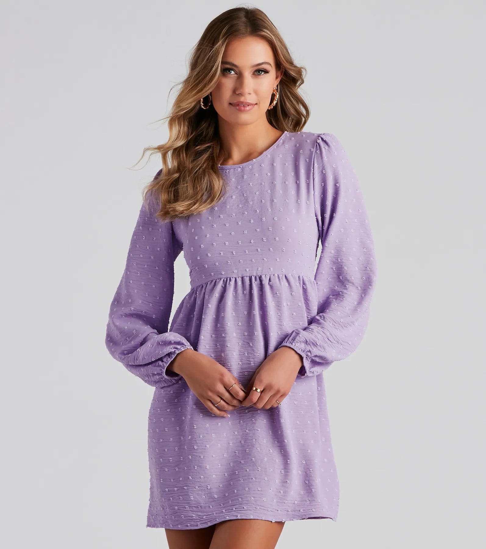 A little bit whimsy with a whole lot of charm! This swiss dot skater dress was made for a day out. It features long peasant sleeves. a crew neck. a back keyhole with button closure. and a flared short skirt. Complete the look in cute mules.