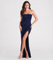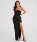 Captivating yet subtle details create the eye-catching Whittney formal crepe dress perfect for fancy parties. cocktail events. and galas! She stuns in a classic strapless square neckline with a padded bust. a fitted bodice. and a pleated side seam that creates the illusion of an hourglass figure. Her curve-hugging. slim-fit silhouette offers a show of skin in a high-cut front slit and a long-length hem that gracefully sweeps along the floor. Complete your dressy look in this formal long dress with earrings and simple block heels!