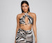 Tap into your wild side with a halter top that makes a fierce impression! The top features a trendy zebra print. a halter neck. a drawstring tie front. and a cropped hem. The top is composed of a smooth knit fabric that offers a form-hugging fit with a moderate stretch. Complete look with the matching midi skirt.