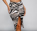 Tap into your wild side with a midi skirt that makes a fierce impression. The skirt features a zebra print. an elastic high-rise waist. a high center slit with a ruched drawstring. and a midi-length silhouette. The top is composed of a smooth knit fabric that offers a form hugging fit with a moderate stretch. Complete look with the matching midi skirt.