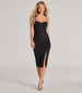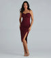 This glitzy glitter midi dress is the perfect elevated style for a wedding or cocktail party! It features a sleeveless sweetheart neckline with a ruched bust. spaghetti straps. a ruched side seam leading to a chic thigh-high side slit. an asymmetric midi-length hem. and a slim-fit silhouette. The glitter knit fabric offers plenty of stretch. Style this mid-length dress with rhinestone heels.