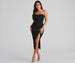 Impress in an elegant midi dress that is simply sophisticated! Zadie features a strapless square neckline. flexible boning. a draped accent at the bodice. and a midi-length silhouette accented with a high side slit. The midi dress is composed of a crepe fabric that offers a form-hugging fit with a moderate stretch. Complete the look with rhinestone heels and an anklet.